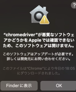 システム設定>プライバーとセキュリティ>Chromeドライバーへのアクセスを許可>再起動