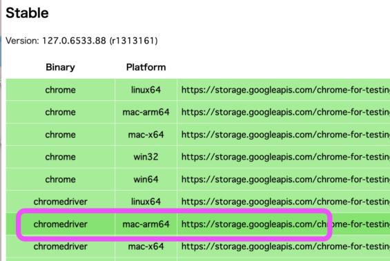 自分のGoogle Chromeのバージョンに合ったChromeDriverを選択します。Chromeのバージョンは、ブラウザの設定から確認できます。