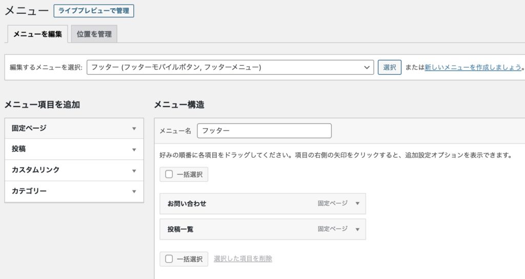 メニュー設定>フッターメニューとフッターモバイルボタンにチェックを入れて>保存