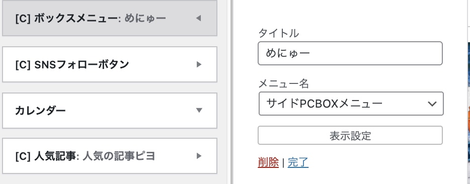 TOPページ>右上のカスタマイズ>ウィジェット>サイドバー>BOXメニュー