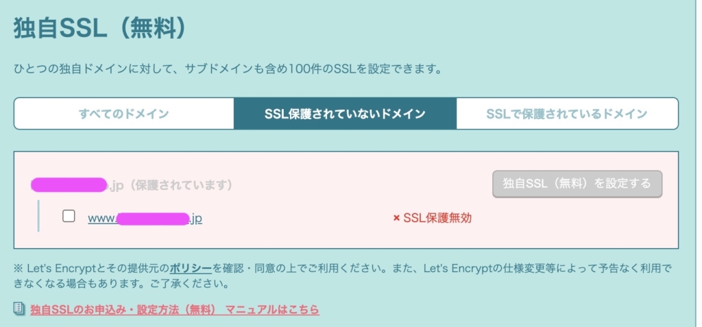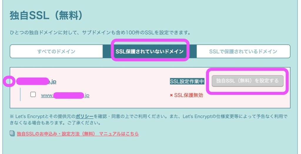 SSLにしたいドメインの頭のチェックボックスにチェックを入れて>独自SSL(無料)を設定するをクリック